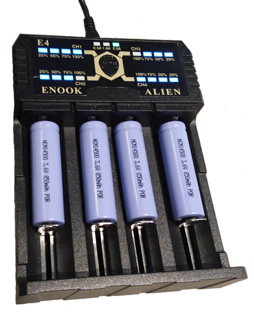 – 2 amp Battery charger for 4 batteries at a time, 14500 or 18650